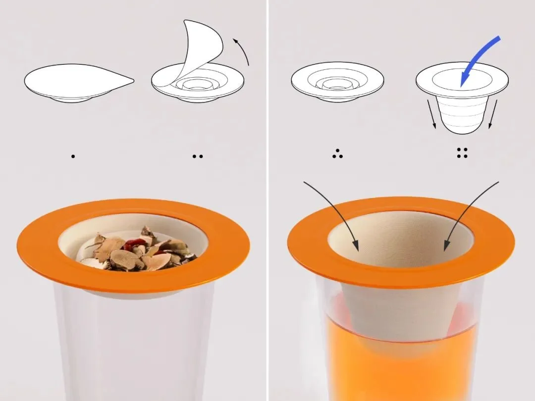 This origami folding structure design adds an element of fun to the brewing process, improves extraction efficiency, and minimizes packaging volume.